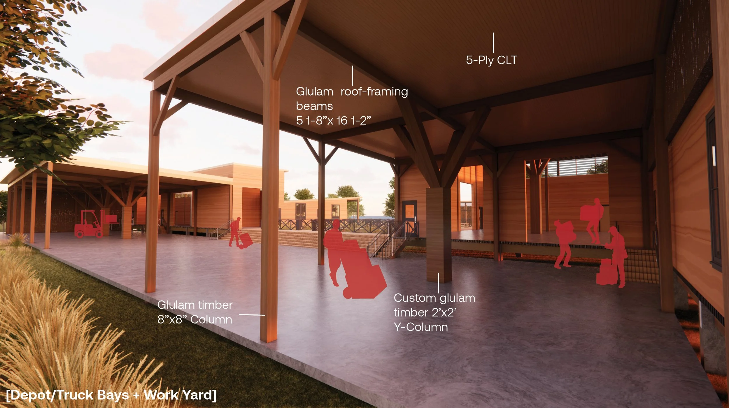 Glulam timber used as the structural system for its 60% lower carbon footprint. During its growth, wood accumulates carbon dioxide (CO₂) from the atmosphere. When used in glulam construction, this carbon remains sequestered within the structure for years